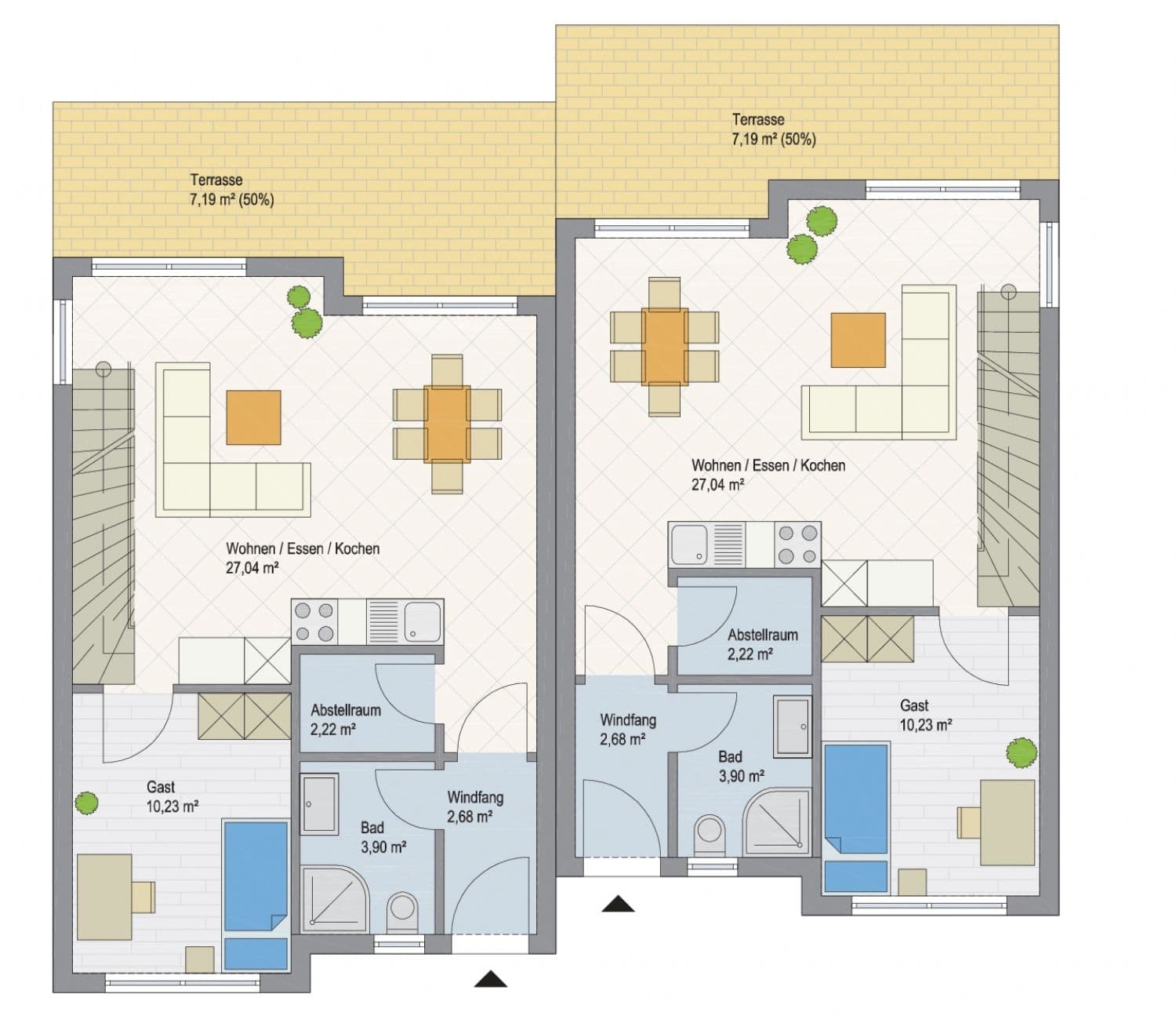 Doppelhaushälfte, inklusive Anschlüsse, Grundstück mit 350m² und schlüsselfertig im hochwertigen Argisol-Bausystem erstellt, ist das ideale Einsteiger-Haus für Singles, Paare und Senioren. Mit einer Gesamtfläche von 52,86 m² bietet dieses Bungalow-Raumsparwunder alle Annehmlichkeiten für hohen Wohnkomfort. Das Erdgeschoss umfasst einen Windfang, ein Bad, einen Abstellraum, einen offenen Wohn-, Ess- und Kochbereich sowie ein Schlafzimmer. Großzügige Fensterflächen lassen viel Tageslicht einfallen und schaffen eine angenehme Wohnatmosphäre. Eine Terrasse bietet zusätzlichen Platz im Freien.