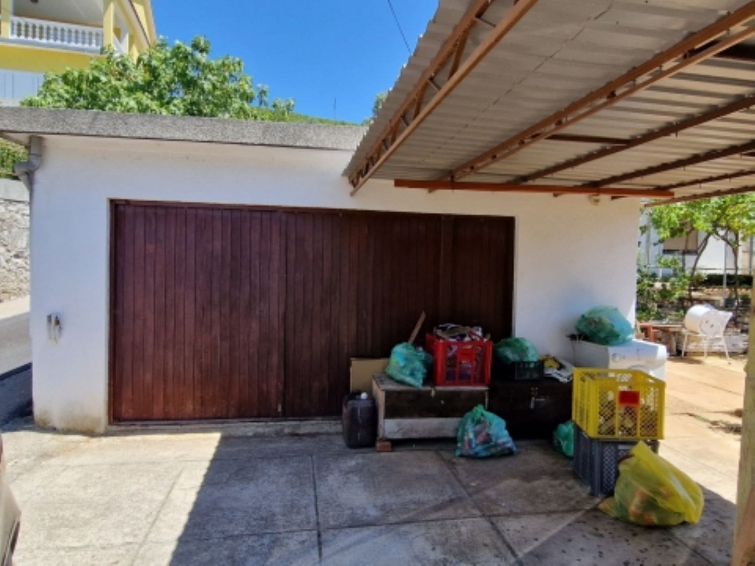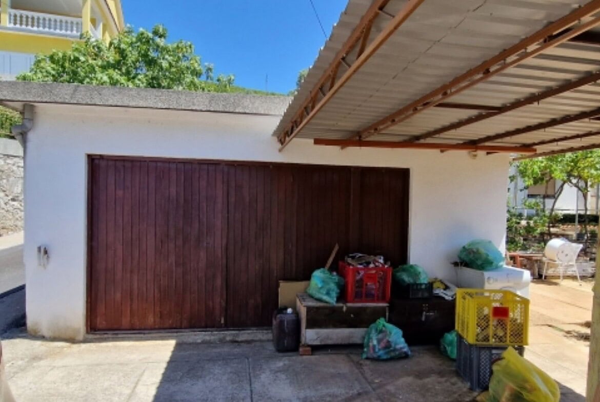 Zum Anwesen gehören eine Eigentumsurkunde sowie drei Parkplätze, darunter eine Garage und ein überdachter Parkplatz. Das Haus wird möbliert verkauft und bietet einen Garten, eine Taverne sowie ein Gartenhaus.