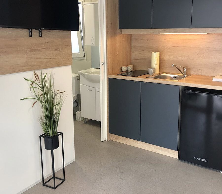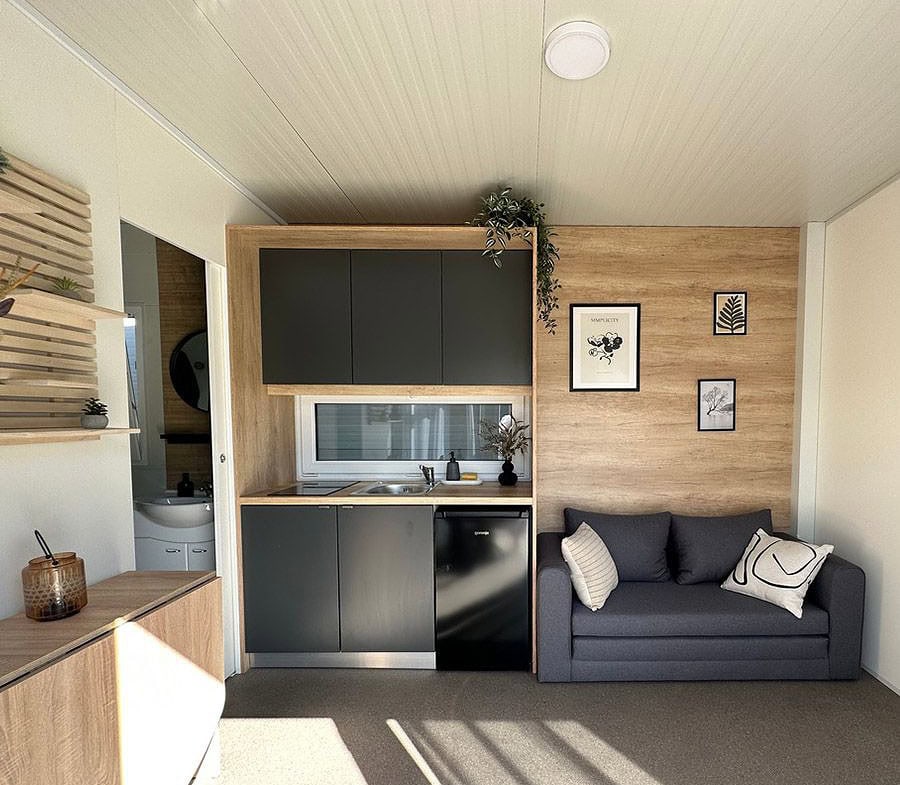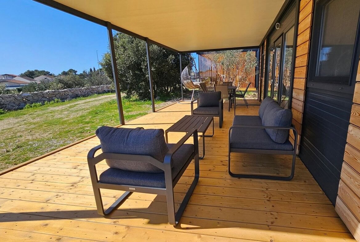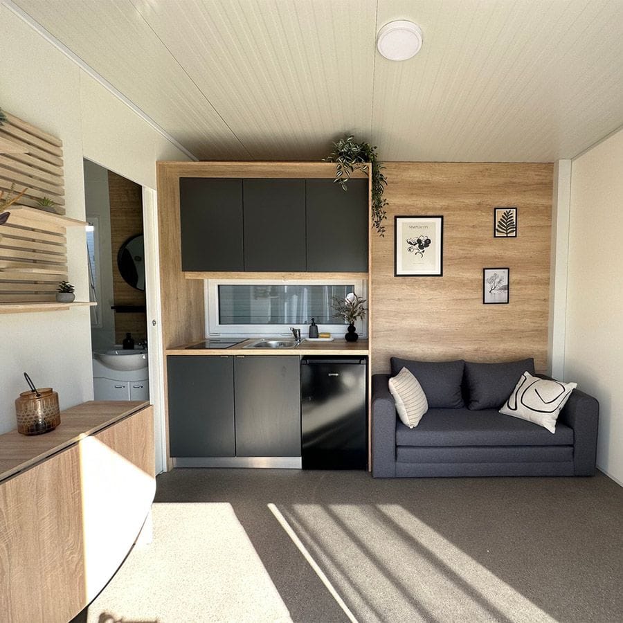 Das Mobilheim bietet einen atemberaubenden Meerblick und ist inklusive Wasser- und Stromanschluss sofort bezugsfertig.