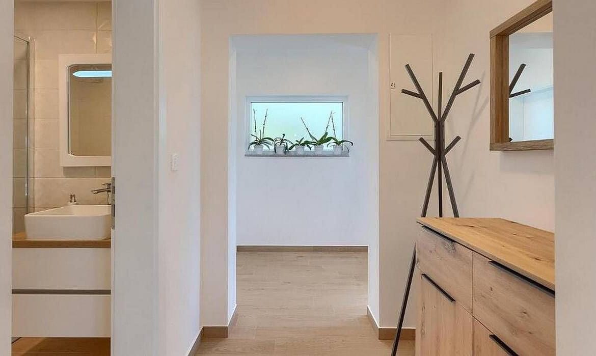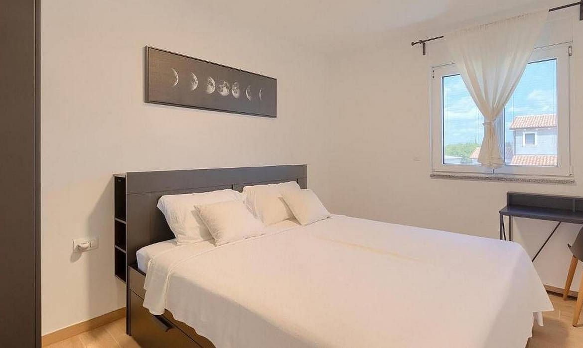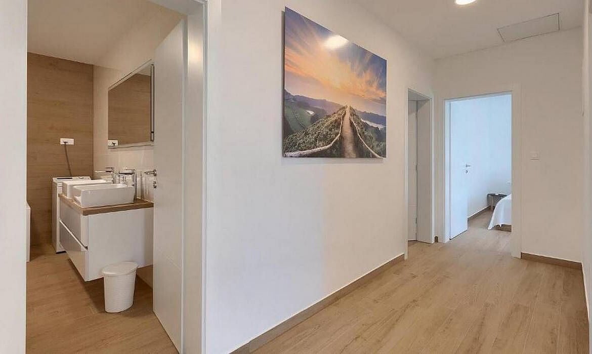 Eine elegante Treppe führt in den ersten Stock, wo sich vier komfortable Schlafzimmer und zwei Badezimmer befinden. Zwei der Schlafzimmer verfügen über einen Balkon mit einem traumhaften Blick auf die grüne istrische Landschaft und den glitzernden Pool – der perfekte Ort, um den Tag mit einer Tasse Kaffee zu beginnen oder bei Sonnenuntergang ausklingen zu lassen.