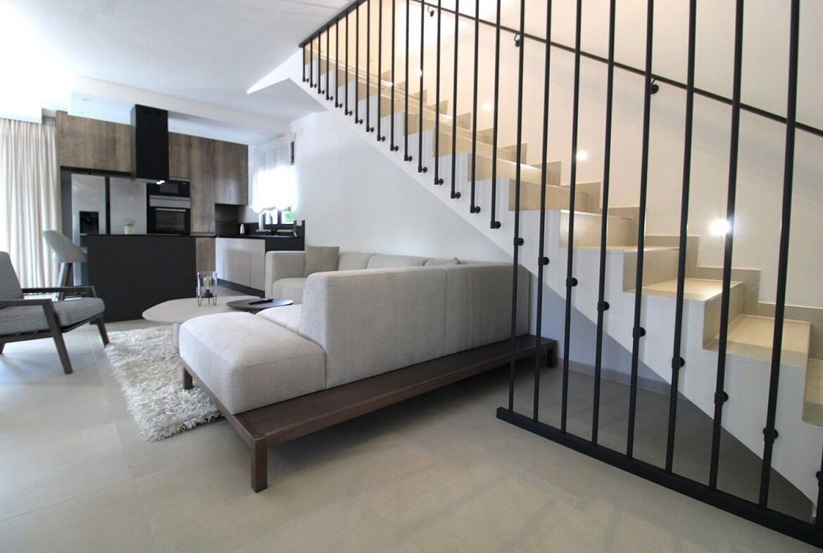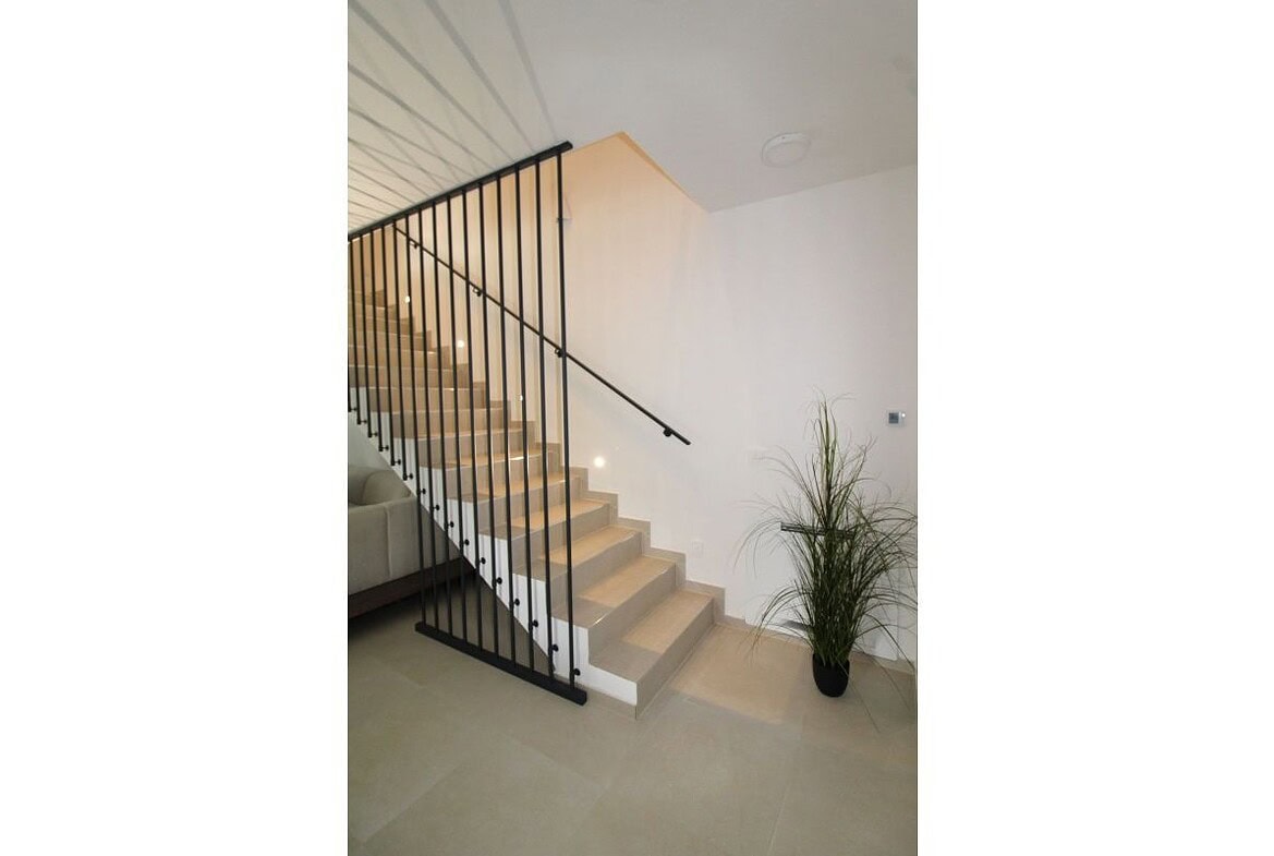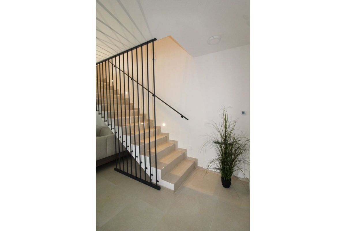 Im ersten Stock befinden sich drei Schlafzimmer, jedes mit eigenem Bad. Das Hauptschlafzimmer bietet zusätzlich eine private, überdachte Terrasse mit Blick auf die unbebaubare Natur und den Swimmingpool.