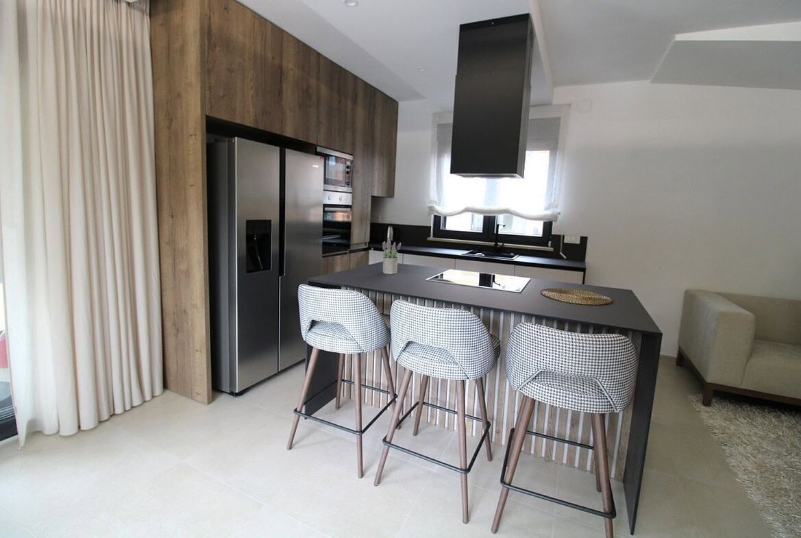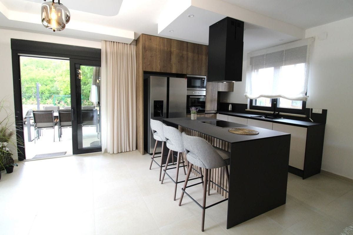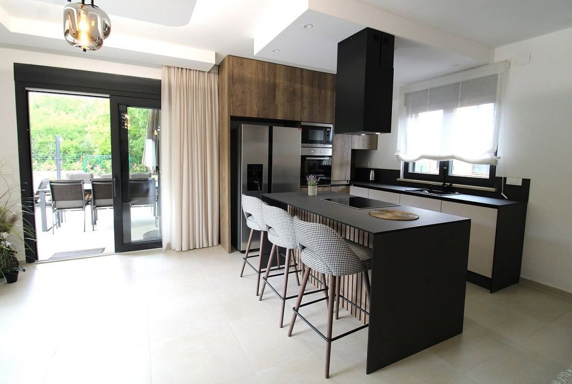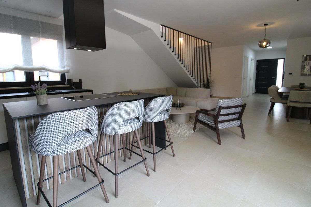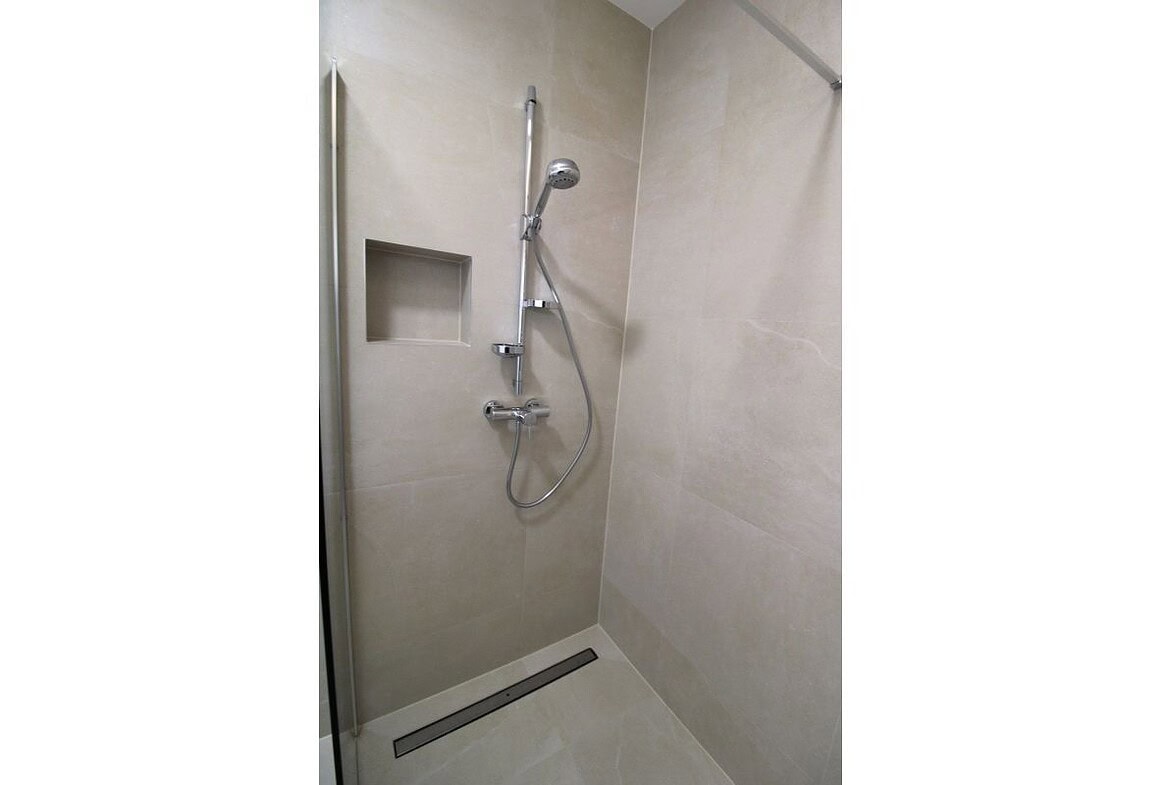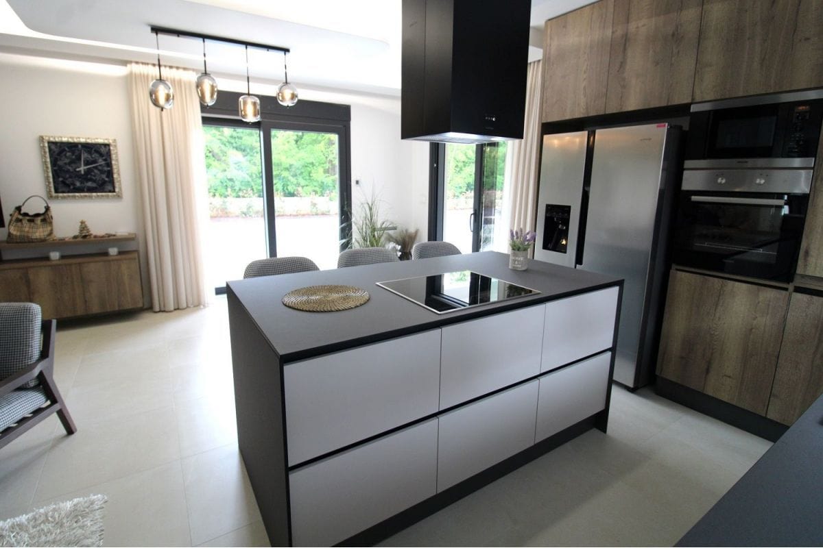 Im Erdgeschoss der Villa finden Sie eine einladende Eingangshalle, einen Heizraum mit Waschküche, ein Gäste-WC sowie ein Schlafzimmer mit eigenem Bad und Zugang zum Hof. Das großzügige Wohnzimmer, Esszimmer und die offene Küche mit maßgefertigten Möbeln bieten viel Platz und bieten direkten Zugang zu einer überdachten Terrasse. Auf dieser Terrasse befindet sich eine Sommerküche mit Kamin, eine großzügige Liegewiese und ein beeindruckender 11 m x 4,5 m großer Pool, der zum Entspannen einlädt. Zudem gibt es eine Außendusche, eine Außentoilette und einen praktischen Abstellraum.