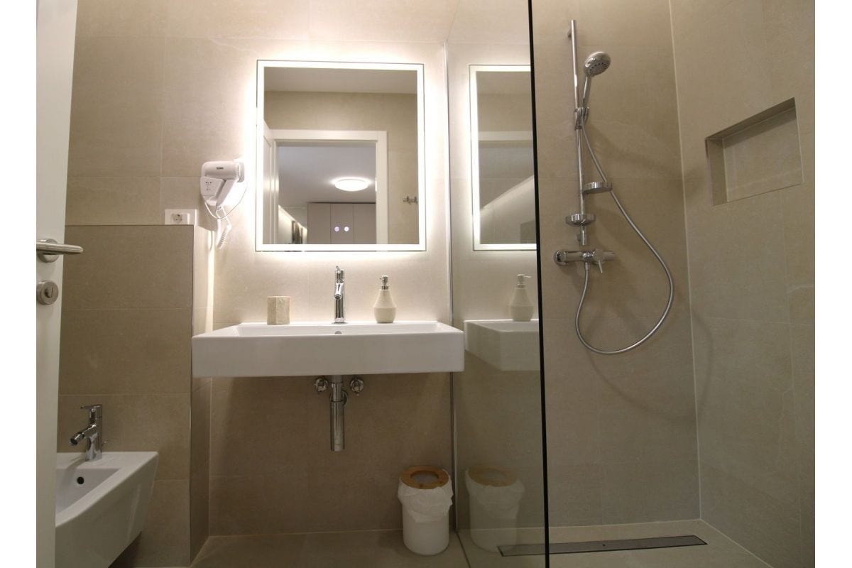 - Badausstattung Dusche, Badewanne, Fenster im Badezimmer