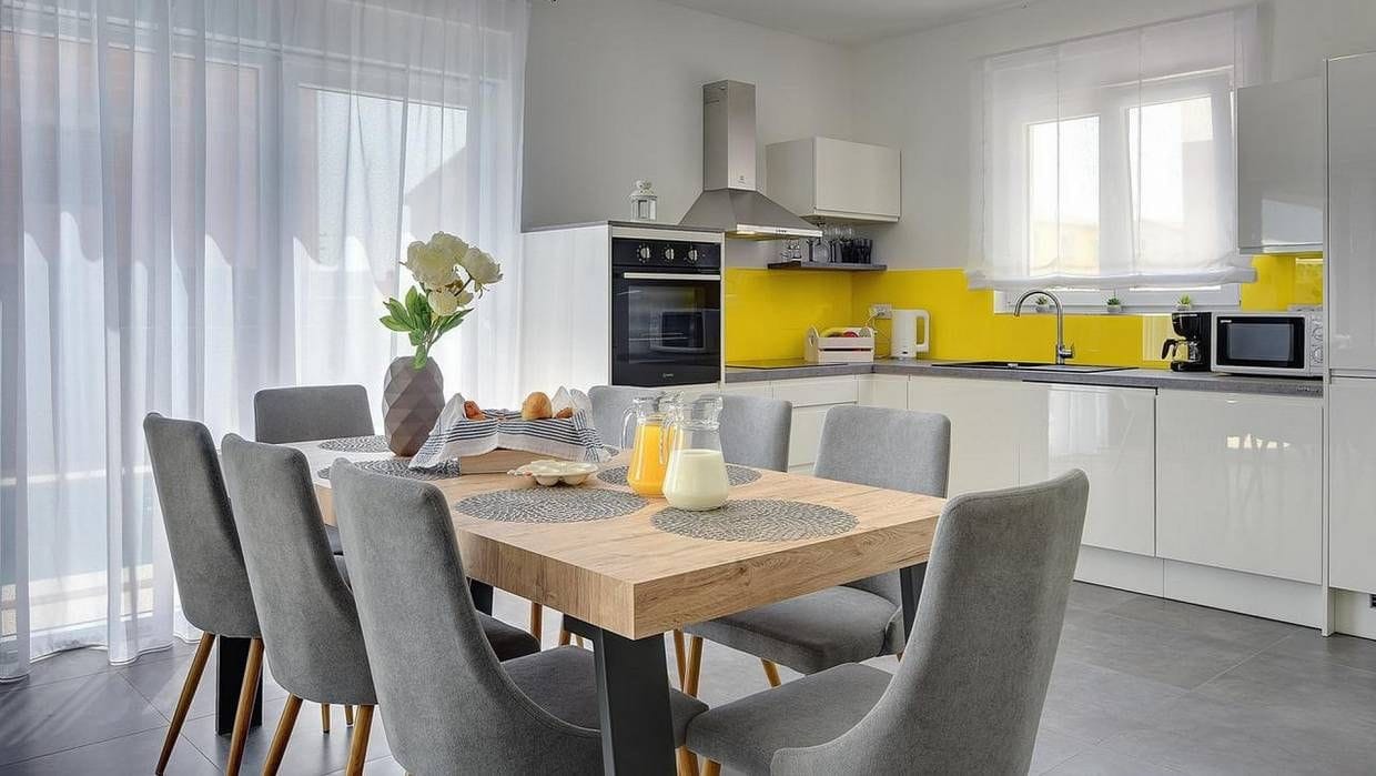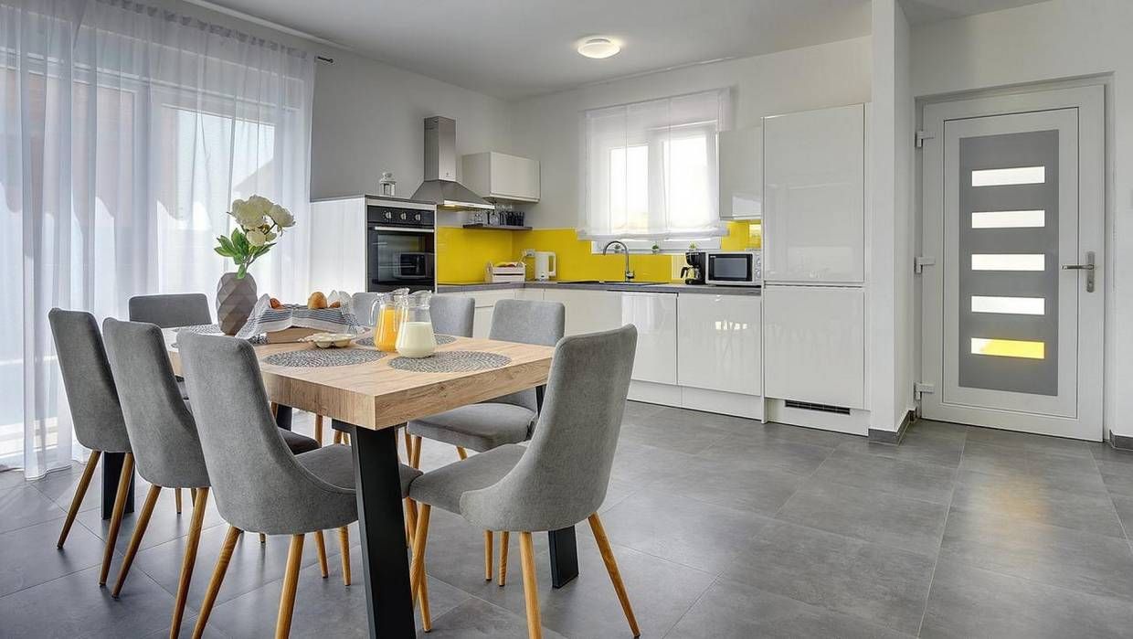 Die Villa erstreckt sich über zwei Etagen und bietet ein durchdachtes Raumkonzept, das modernen Wohnkomfort und mediterrane Atmosphäre harmonisch verbindet. Im Erdgeschoss erwartet Sie ein offener Wohnbereich mit einer eleganten, voll ausgestatteten Küche und einem großzügigen Esszimmer. Das komfortable Wohnzimmer öffnet sich zu einer überdachten Terrasse, die direkt zum Garten und Poolbereich führt. Im selben Geschoss befinden sich zudem ein modernes Badezimmer und Zugang zu einer nicht überdachten Terrasse mit Kamin und Sommerküche – ideal für gemütliche Abende im Freien.