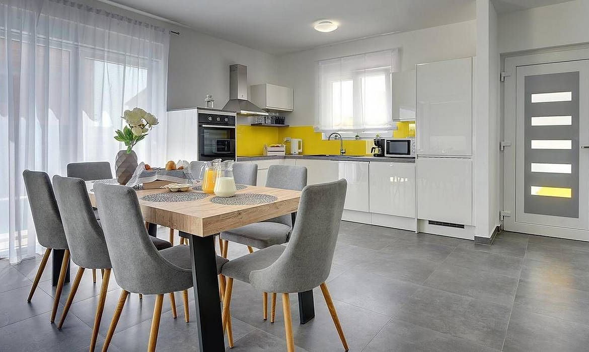 Die Villa erstreckt sich über zwei Etagen und bietet ein durchdachtes Raumkonzept, das modernen Wohnkomfort und mediterrane Atmosphäre harmonisch verbindet. Im Erdgeschoss erwartet Sie ein offener Wohnbereich mit einer eleganten, voll ausgestatteten Küche und einem großzügigen Esszimmer. Das komfortable Wohnzimmer öffnet sich zu einer überdachten Terrasse, die direkt zum Garten und Poolbereich führt. Im selben Geschoss befinden sich zudem ein modernes Badezimmer und Zugang zu einer nicht überdachten Terrasse mit Kamin und Sommerküche – ideal für gemütliche Abende im Freien.