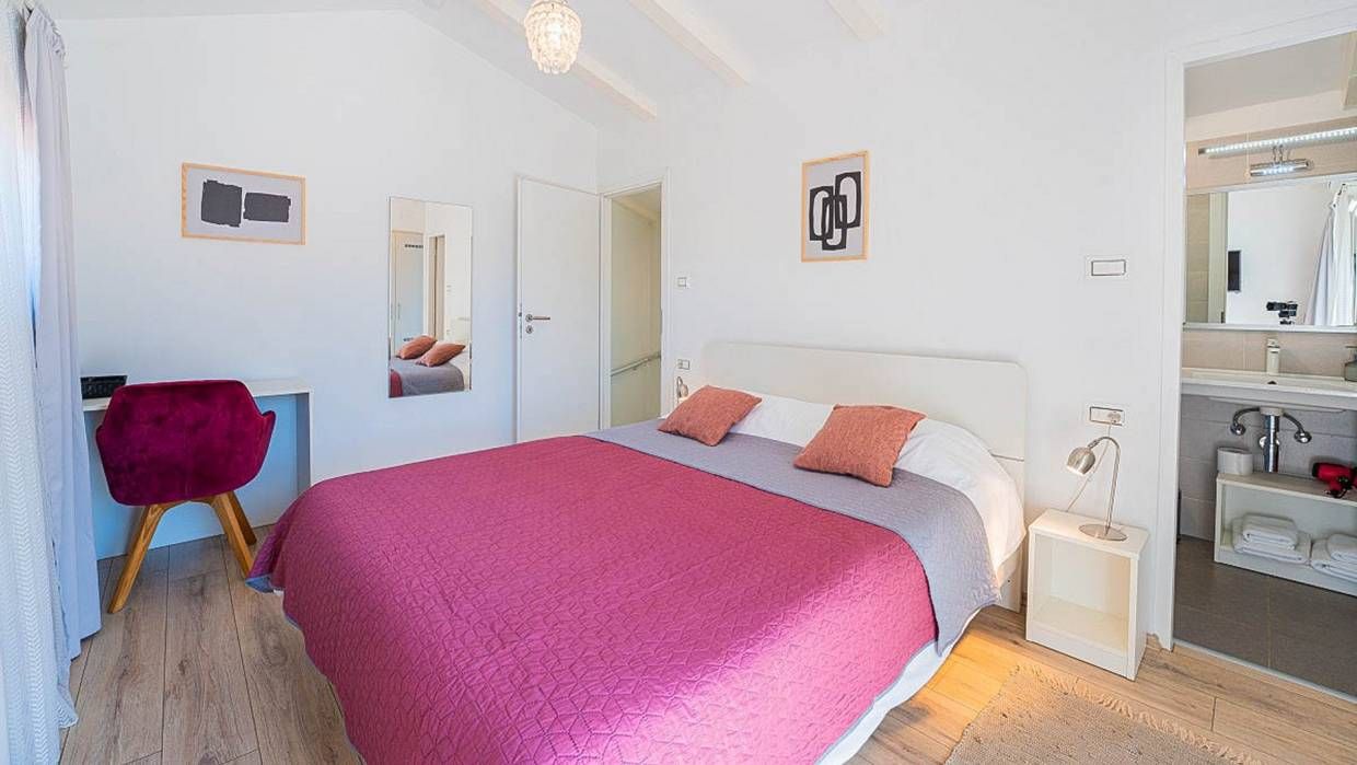 Über eine elegante Innentreppe gelangen Sie ins Obergeschoss, wo sich ein weiteres, großzügiges Schlafzimmer mit eigenem Bad und begehbarem Kleiderschrank befindet – ein privater Rückzugsort mit viel Raum zum Entspannen.